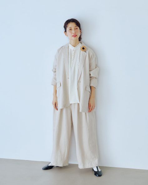 リネンジャケット リネンパンツセットアップ¥23,100、ブラウス¥11,000/すべてスタディオクリップ(アダストリア カスタマーサービス)、ピアス¥38,500、パールリング¥44,000/ともにマサナ(マサナ)、ブローチ¥8,580/ピモンテ(ピモンテ)、シューズ¥30,800/キャットワース(グラストンベリー ショールーム)