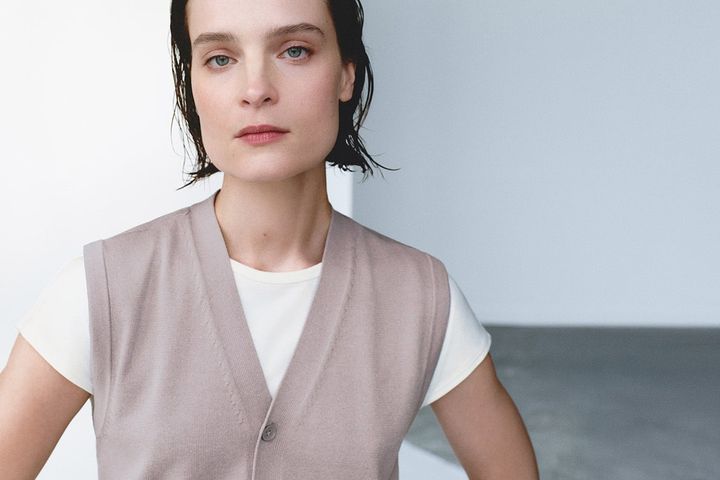 やわらかな手触りで、素肌に直接着ても心地いいニットベスト。レイヤリングしてもすっきりとまとめやすいシルエットです。