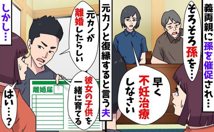 そして、夫の考えに賛同し、「あなたたち4人で仲良く暮らせばいいじゃない!」と義母は言います。さらに、「戸籍も傷つかず、子どもも得られるのだから良い話ではないか」と義父も賛同。