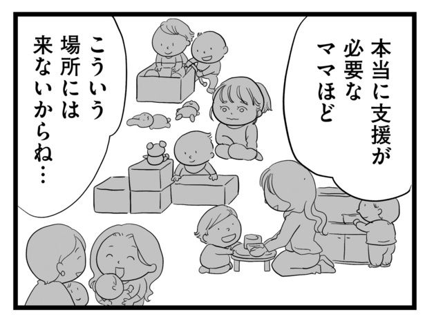 ――子育て広場で働く主人公の同僚が「支援が必要なママほどこういう場所には来ないからね…」と言うシーンがありました。