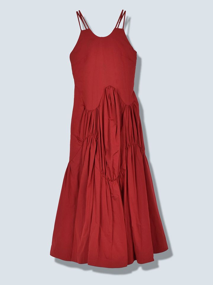 波打つようにうねる曲線&たっぷりのギャザーが目を引くキャミソールワンピース。1枚でサマになるうえ、シャツやカーディガンとの重ね着も楽しめる優秀アイテム。