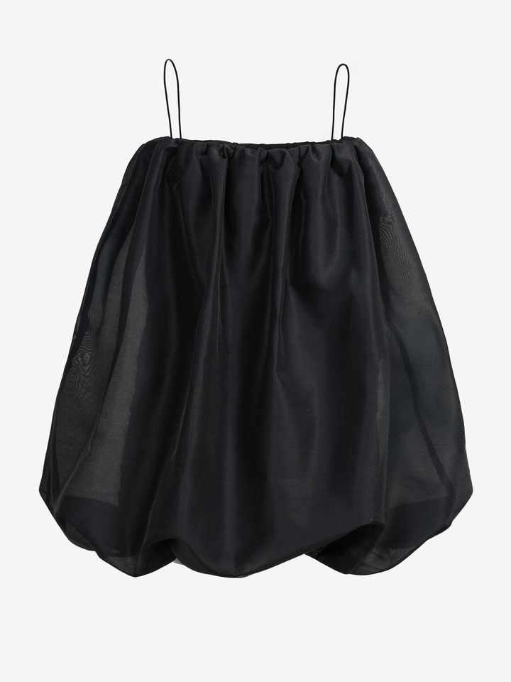 風船のような立体ボリュームシルエットを、繊細なストラップで上品に昇華。裏地についたドローストリングを縮めればキャミソールトップにもなる便利な2way仕様。