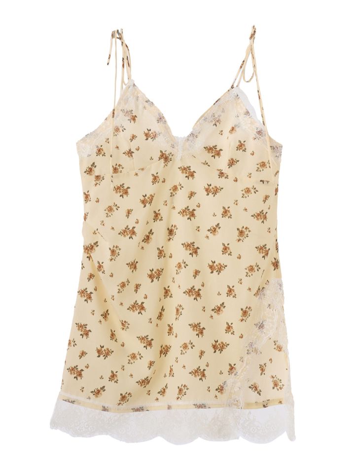 さりげない光沢のサテンに小花柄、センシュアルなレースを組み合わせた主役級の1枚。結べるショルダーストラップやサイドスリットなど、細部へのこだわりも自慢。