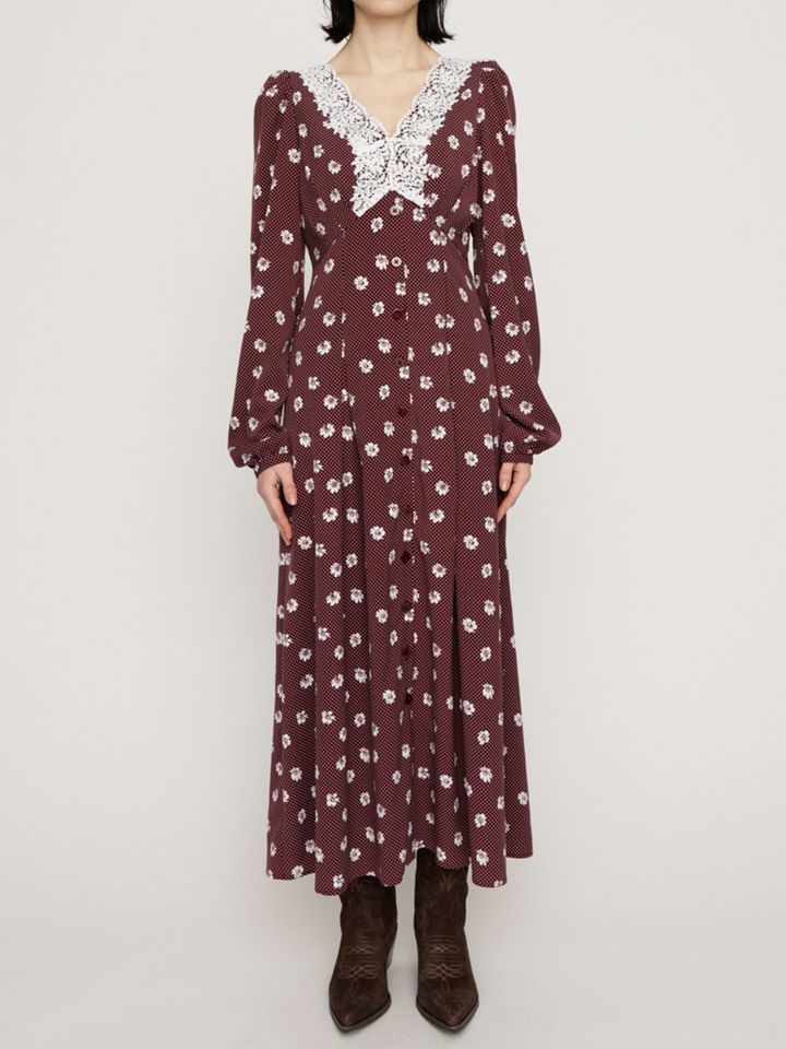 レトロムード漂うオリジナルのドットフラワー柄に熱視線。高めの位置に配したウエスト切り替え&縦ラインのフロントボタンで、スタイルアップ効果も期待できる。