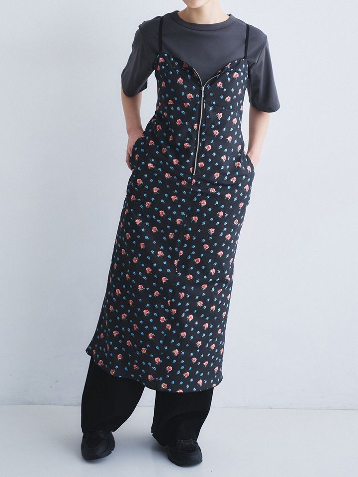 軽やかでさらりとした肌触りのタフタ素材を採用。オリジナルのほぐしフラワープリントにフロントジップを添えた、レトロ×モードな新感覚デザインにセンスが光る。