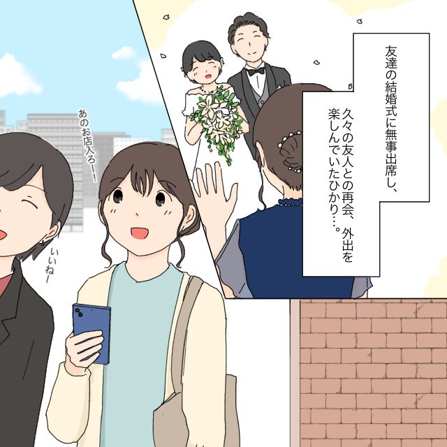 翌日、私は予定通りマミの結婚式に参列しました。ウエディングドレスに身を包んだマミは本当に綺麗で、思わず涙がこぼれます。子どもたちを産んで以来、久しぶりに参列する結婚式。この多幸感あふれる空間は、やはり結婚式でしか味わえないものだと実感しました。不安はあったけれど、夫に子どもたちを預けてきてよかった。