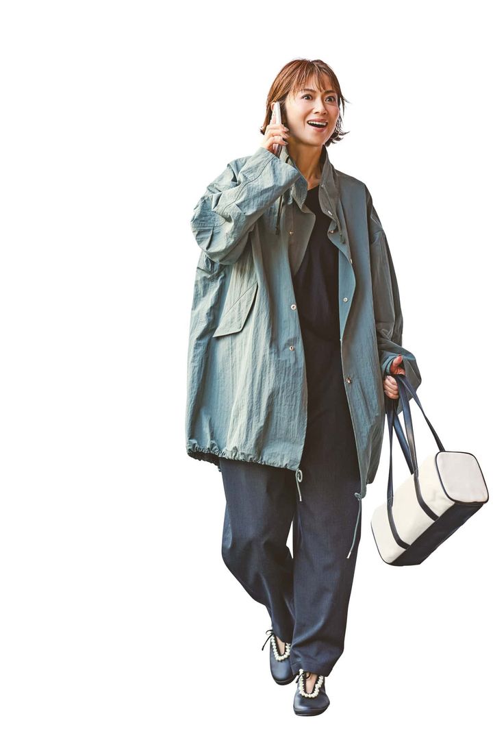 オーバーサイズのおじコート×ボンタンパンツのゆるシルエットも、華やぎフラットで手抜き感を払拭。はき心地の良い立体パンツで動きやすさをキープしつつ、ラフすぎず大人っぽくまとまります。
