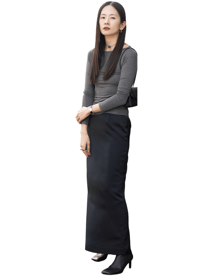「バンブー素材が滑らかな着心地のカイのトップスは、サテンのスカートを合わせ、Iラインが90年代っぽいミニマルスタイルに仕上げました。マチューが作る新生シャネルのリラクシーな雰囲気がとても好きで、プレコレクションではプレッピーココを購入しました」