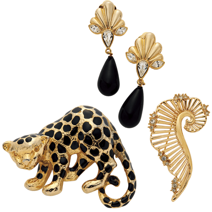 インパクトのあるレオパードのブローチ「ファインジュエリーとヴィンテージジュエリーを組み合わせたスタイルが好き。今季は特にイヤリングやブローチに注目しています。存在感のあるユニークなデザインはシンプルな着こなしのポイントに」ヴィンテージジュエリーは全て本人私物