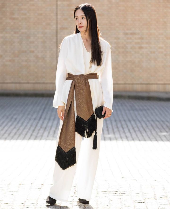 「大好きなフィアーのサテンシリーズは、新しく購入したカーディガンとパンツをセットアップ風に。小物でオリエンタルな雰囲気をプラスするのが好きなのですが、今季はフリンジストールをベルト風に巻くスタイルに注目しています」