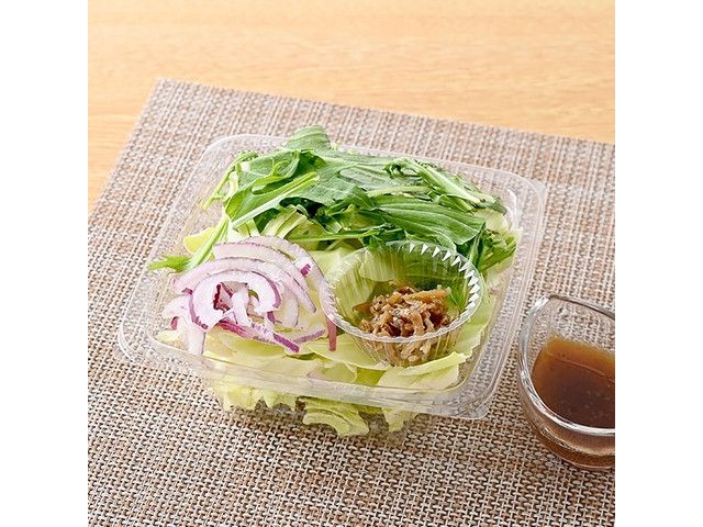 キャベツに水菜・紫玉ねぎ・山椒風味のじゃこを合わせました。ごま油醤油ダレ付きです。