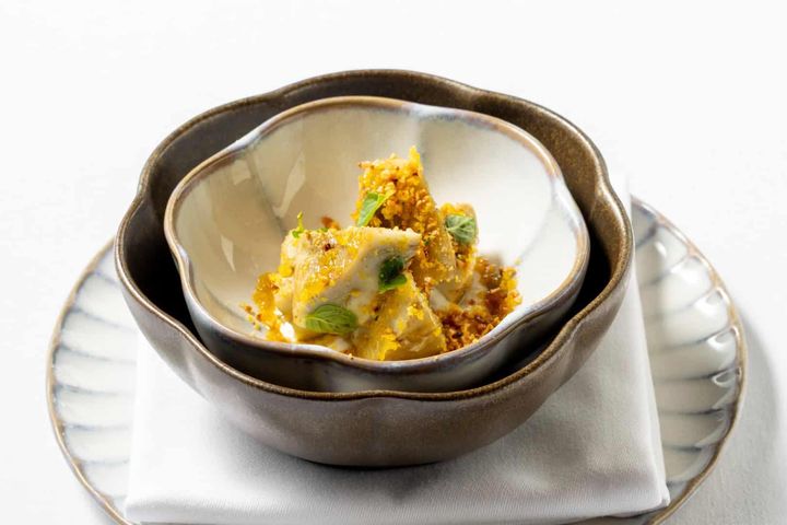 「カルチョーフィ・アッラ・ロマーナ アーティチョーク ミント オリーブオイル 長崎県産カラスミ」ホクホクとした旬のアーティチョークを使ったローマの伝統的な前菜に、長崎県産カラスミを合わせることで、海の旨みが加わった洗練された一皿に。