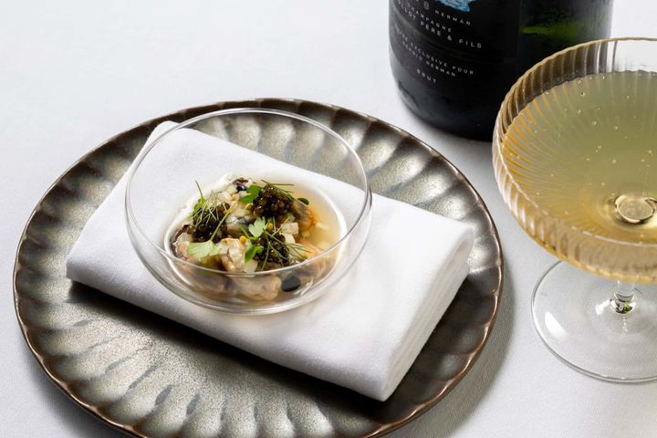 「冷製ムール貝 エルダーフラワー セロリ マスタード エシャロットピクルス キャビア」&ピオロ - ブリュット レゼルヴ キュヴェ セルジオ ハーマン旅の始まりは、「冷製ムール貝」と、オリジナルシャンパーニュのペアリングから。故郷ゼーラントの海を思わせるムール貝の凝縮した旨みを、華やかで伸びやかなシャンパーニュが包み込みます。