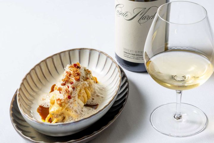 この食の物語を完成させるのは、エグゼクティブ ソムリエ・森 覚氏が厳選する至高のペアリング。カルボナーラには、同じラツィオ州で親しまれる白ワイン「フラスカーティ スペリオーレ」をセレクト。白い果実やハーブ、花のニュアンスが広がるフレッシュでピュアな味わいが、カルボナーラのコクを引き立てながら、魚介の旨みと柑橘の爽やかさを際立たせます。