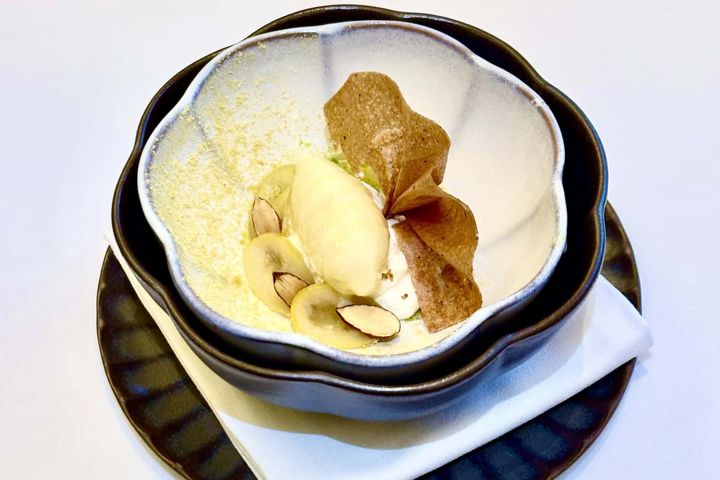 「四国レモンのコンフィ リコッタ アーモンド アカシアハチミツ バジル」ローマの伝統菓子に使われるリコッタチーズをベースに、アブルッツォ州に馴染みのあるアーモンドアイスクリームにアカシアハチミツをまとわせ、爽やかなレモンとバジルのソースを添えたデザート。