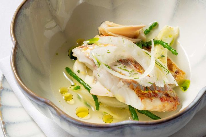 「イトヨリのブロデット フェンネル 蛤 パセリ アブルッツォ産ペペロンチーノ」魚介をペペロンチーノ(唐辛子)とオリーブオイルで調理するアブルッツォ州の食文化を再解釈。日本ならではのイトヨリと蛤で、澄んだ旨みをストレートに感じられる一品に仕上げています。