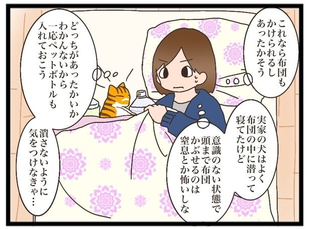 ぴなぱさん(以下、ぴなぱ):お湯を入れたペットボトルで茶トラの身体を温めようとしたんですが、全然温まらなかったんです。しっかりペットボトルの面に触れていないと温かくならないし、かと言って猫の身体に押し付けると猫にとっては硬いし……それに、これでちゃんと温かいのか分からなかったので、「これで大丈夫なのかな」という不安がありました。