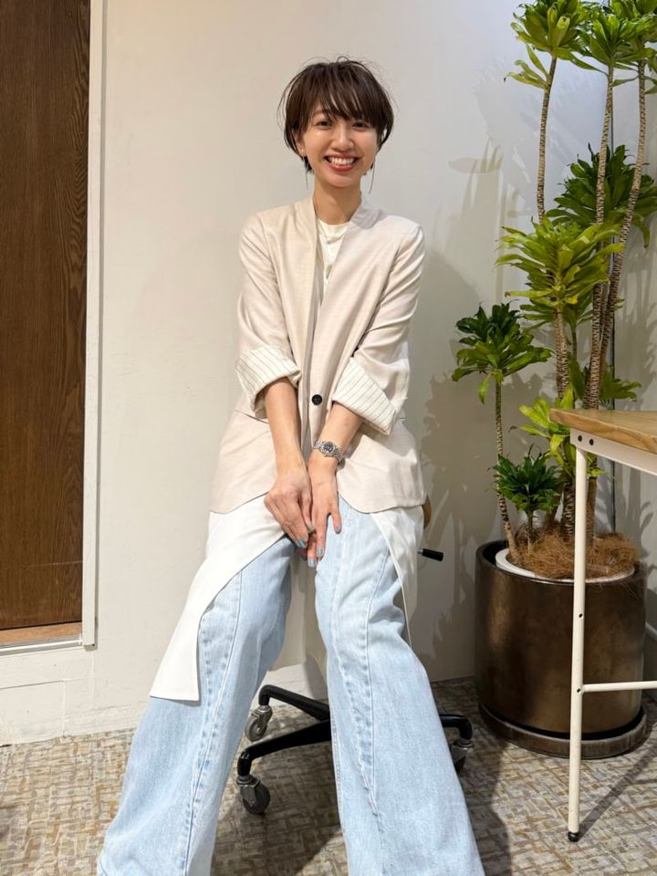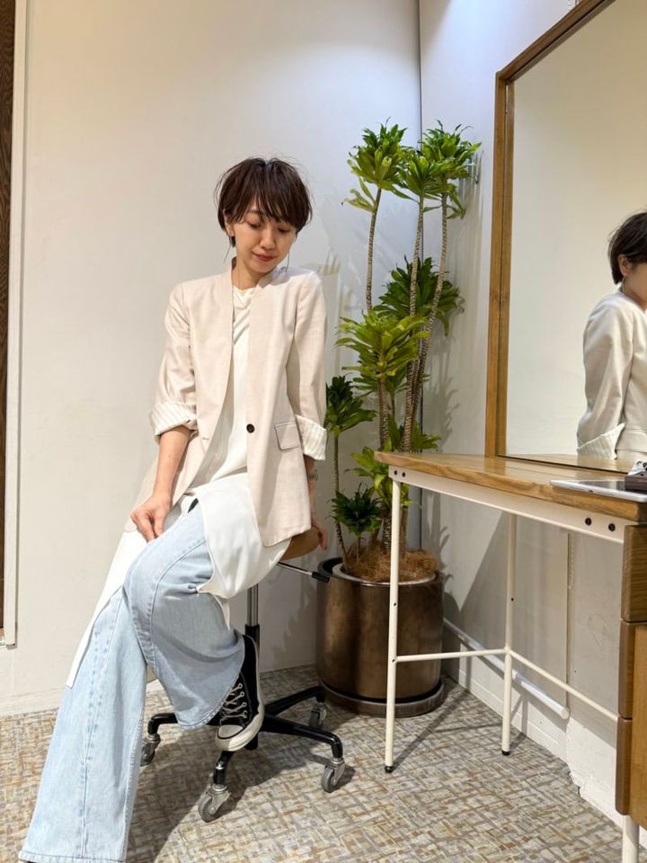 「ニュアンスのある白ジャケットと、潔い真っ白なキャミワンピをレイヤード。ボトムスはデニムをセレクトし、カジュアルダウンしました! 足元は黒のコンバースで抜けをプラスして、こなれ感を意識しています」(美容師・丸岡奈央さん)