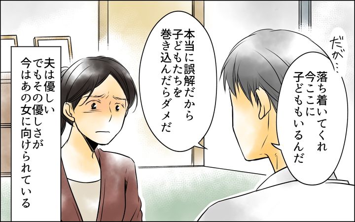 夫の優しさや気遣いはあの女に向けられ、そしてあの女はそんな夫の気持ちを平然と受け止めているように見えました。さらには夫が迷って言葉に詰まると、あの女はそんな夫の言葉をやんわりと受け止めながら自分の意思で意見を話す。その光景は、まるで夫婦みたいな阿吽の呼吸。惹かれあうふたりの間で私はまるでピエロにでもなってしまった気分でした。