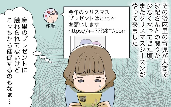私も「このプレゼントを麻里にお願いします」と気軽に伝えればよかったのかもしれません。でもプレゼントの要求はしてきても、麻里のことは何も触れない沙紀さんに連絡するのは気が重くて。だから荷物が届いたときはとても嬉しかったのですが…。