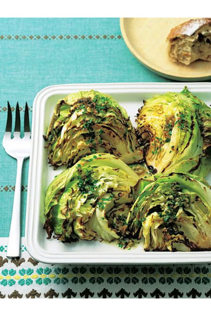 みずみずしい春キャベツは、サッと火を通すだけで甘みが増してジューシーに。フライパンで両面をこんがり焼いてから、オーブンへ入れるひと手間がポイント。焦がした部分の香ばしさが風味のアクセントになる。うま味たっぷりのアンチョビソースをかけて召し上がれ。