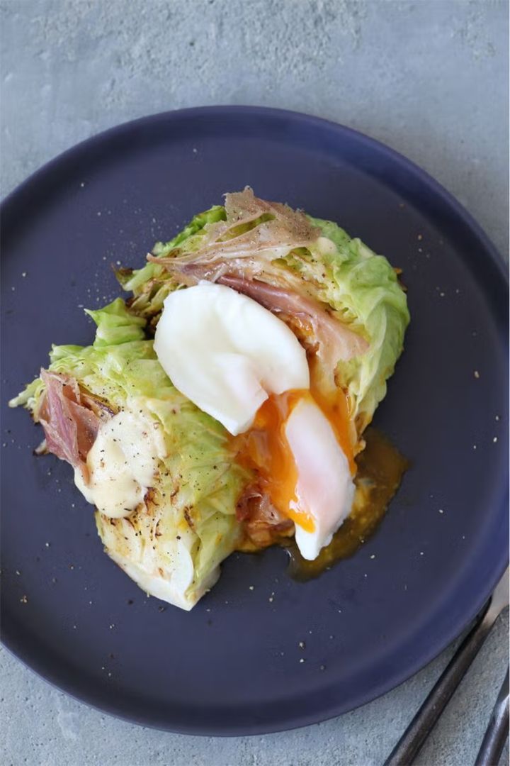 蒸し焼きにした甘い春キャベツに、生ハムとホワイトソースを添えてコクをプラス。仕上げにポーチドエッグをのせれば、濃厚な黄身がソースの役割を果たし、リッチな味わいに。