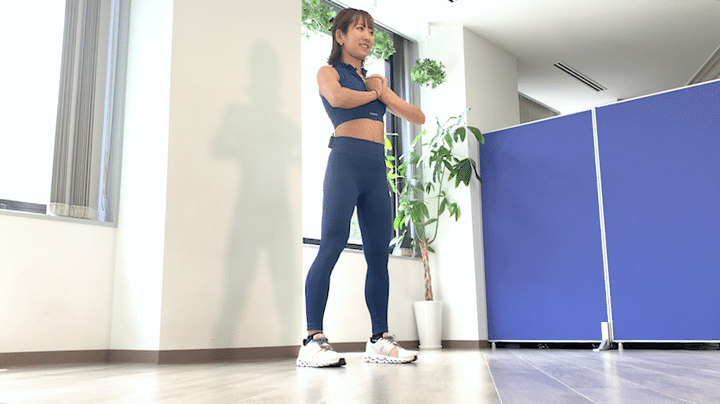1.手は頭の後ろにセットして、足を肩幅に広げる