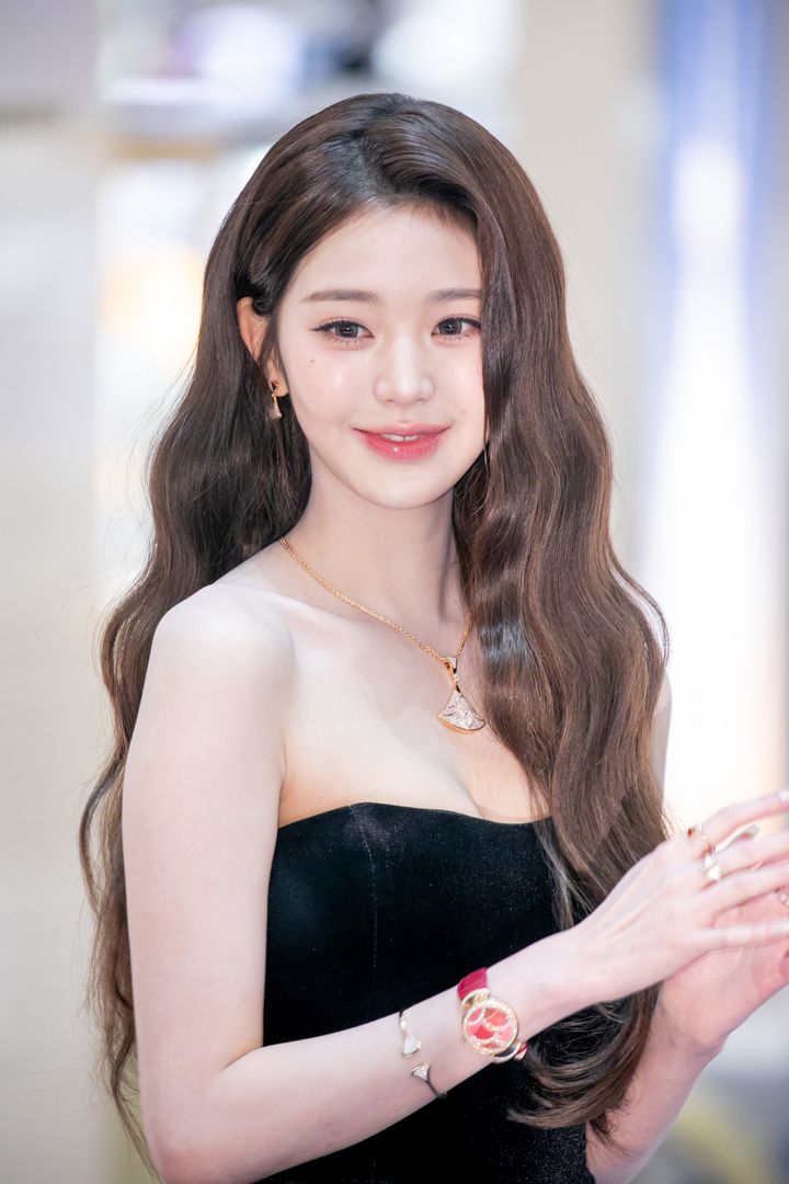 韓国アイドルの卵型代表格といえばウォニョン。フェイスラインが見えるように前髪をアップにし、ボリュームたっぷりなウェーブ髪に仕上げたときに、その魅力がさらに際立つ。なめらかなフェイスラインと共鳴し、まるで女神のような華やかさとオーラを放って。