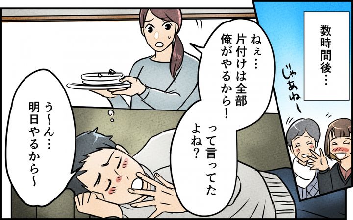 でも夫が選んだのは義家族を呼んでの家パーティー。「俺たちで準備する」と言ったはずなのに、気づけば妻がほぼひとりで動いていたようです…。