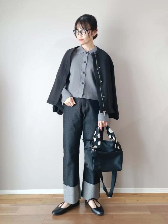 デニムパンツ×レイヤード風カーディガンのコーデ
