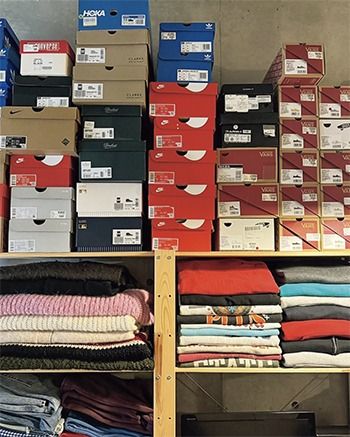 コンパクトな部屋に2人で住んでいて、お互い服が好きなので物量も多め。物が多いことを逆手にとって、あえて見せる収納にしています。ゴチャゴチャさせないように、いかに圧迫感なく見せられるかを意識。大好きなスニーカーは、入っていた箱までいとしいので、処分せずに棚に積み上げてストック。増えていくのが目に見えてわかって充足感があります。(misaさん・販売員)