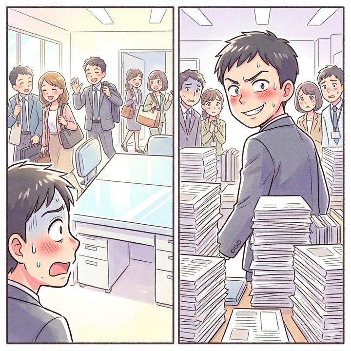 定時を過ぎてすぐ、全員が笑顔で「お疲れ様!」と帰宅していく様子を見て、彼は目を見開いて固まっています。