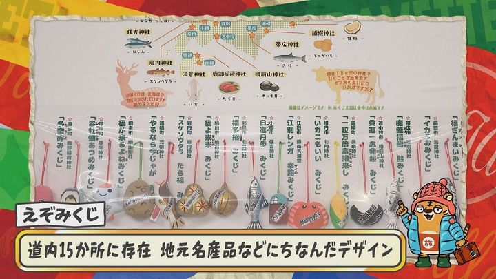 ちなみにえぞみくじは、全道に15か所存在していて、地元の名物や特産品にちなんだデザインがされているんだ!