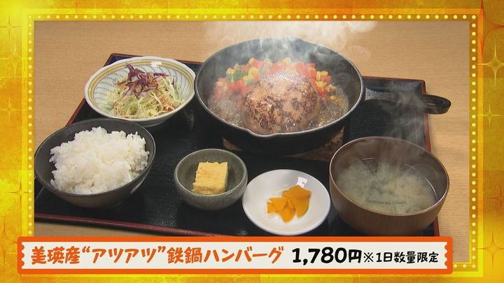 松尾アナ:「数量限定ブランド豚の熱々鉄鍋ハンバーグ!」新くん:「やばっ~!」