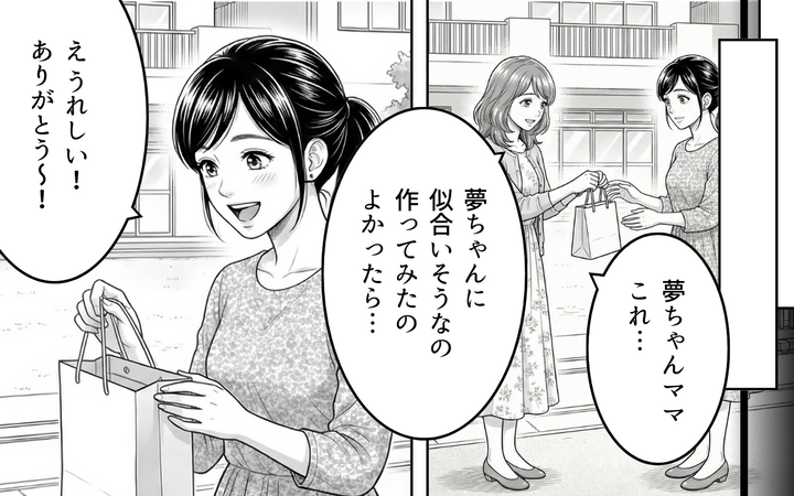 ママ友のために心を込めて用意した贈り物を手に、驚く顔を想像してワクワクしている様子。