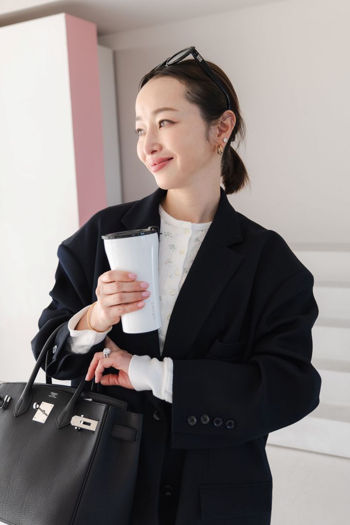 撮影の日は移動の多さや着替えやすさを意識しながら、その後の予定にも対応できるよう、ジャケットで程よいきちんと感を。お気に入りで色違いで揃えているオーバーサイズジャケットは、この春に向けて新しくネイビーを迎えました。さらりと羽織るだけでシルエットが整い、自然と背筋が伸びる頼もしい存在です。