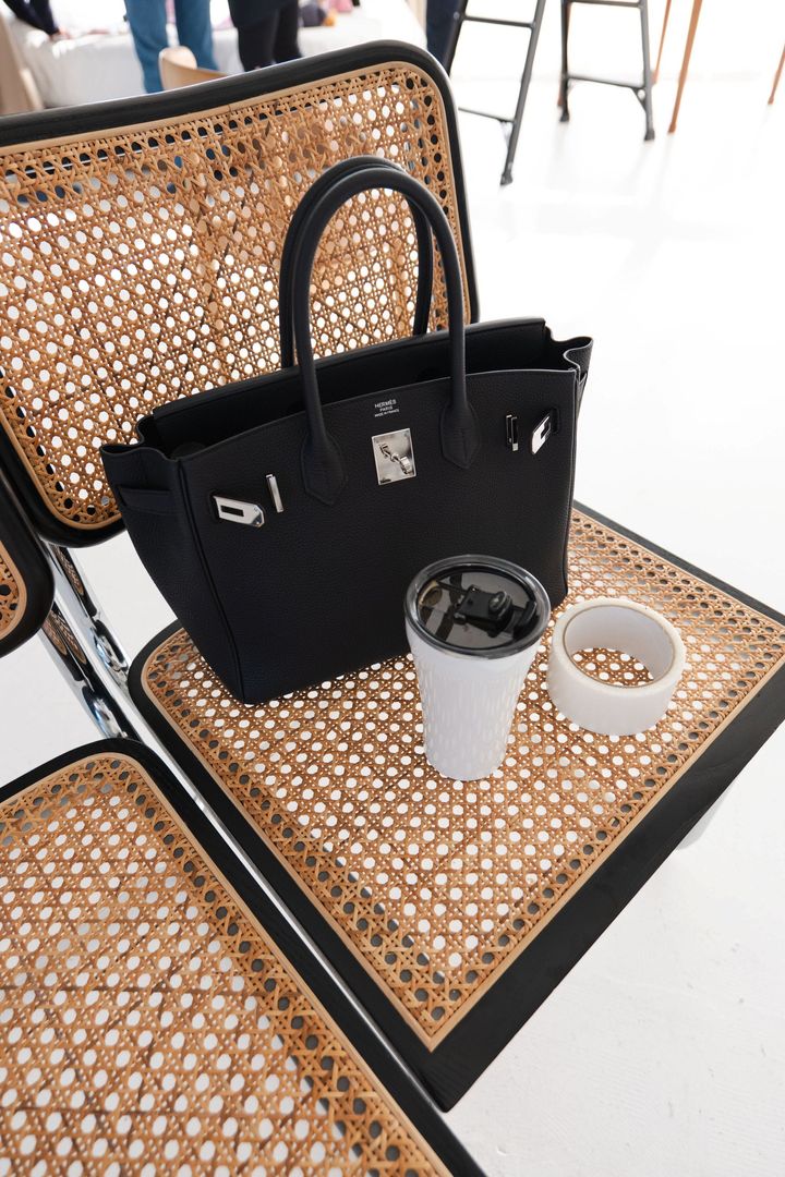 バッグはクラシカルなエルメスのバーキン30を合わせて装いを端正に引き締め、足元はカーキ色のパンプスで、かっちりしすぎない抜け感を。動きやすさと美しさ、そのどちらも大切にしたい撮影の日の装いです。