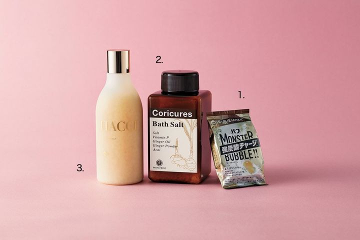 1.バブ錠剤史上最大の白濁濃度! 温浴効果を高め疲労回復。バブ モンスターバブル よくばりミルキー[医薬部外品] 6錠入り ¥990〈編集部調べ〉(花王) 2.海塩に3種のジンジャー成分を保湿成分として配合。コリキュアーズ バスソルト n 495g ¥2,420(ハウス オブ ローゼ)3.国産海塩にハチミツパウダーとパパイン、ビタミンCなどをコーティングしたバスソルト。入浴するたびに肌がツルツルに。BEE バスソルト ミルキーハニー 300g ¥4,400(HACCI)