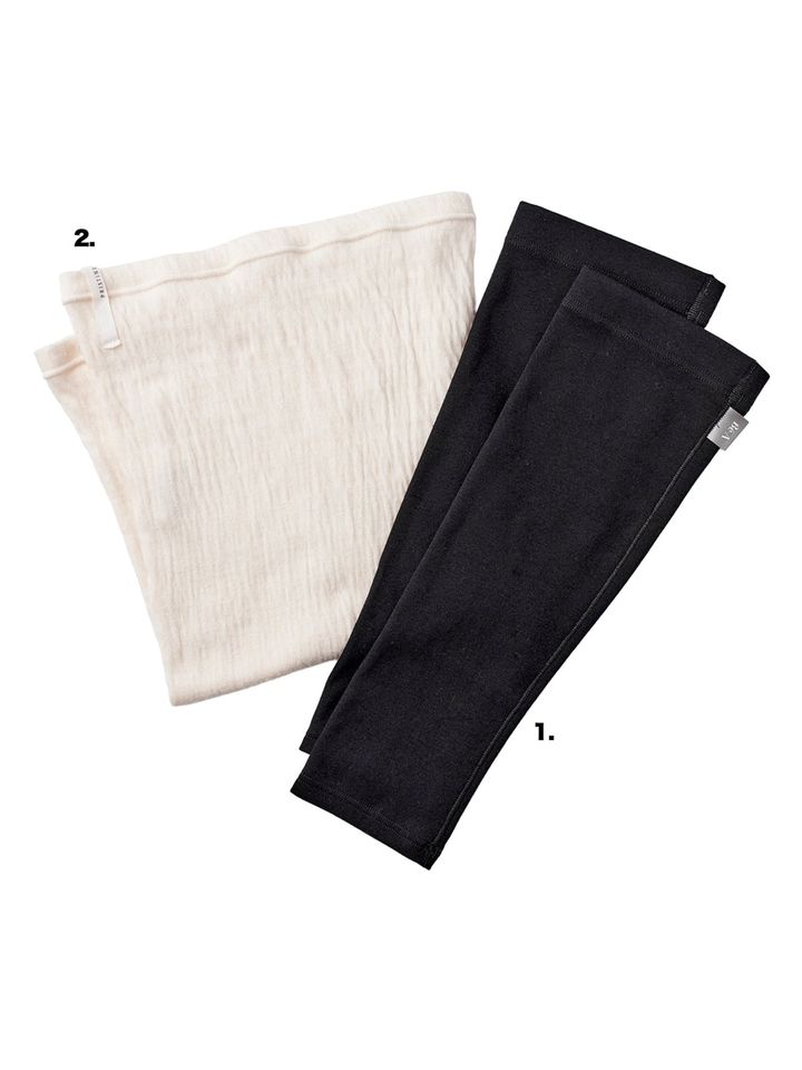1. 1秒間に1兆回振動する電磁波「テラヘルツ波」を放出する磁石をプリント。冷えやすい足首を温もりで包む。ベア テラヘルツ レッグウォーマー ¥2,750(Bé-A Japan) 2.無染色で柔らかい風合いのオーガニックコットン使用。縫い接ぎのないチューブ状で体温を逃さず、蒸れずに快適。シルクオーガニックコットン チューブ腹巻 ¥4,400(プリスティン本店)