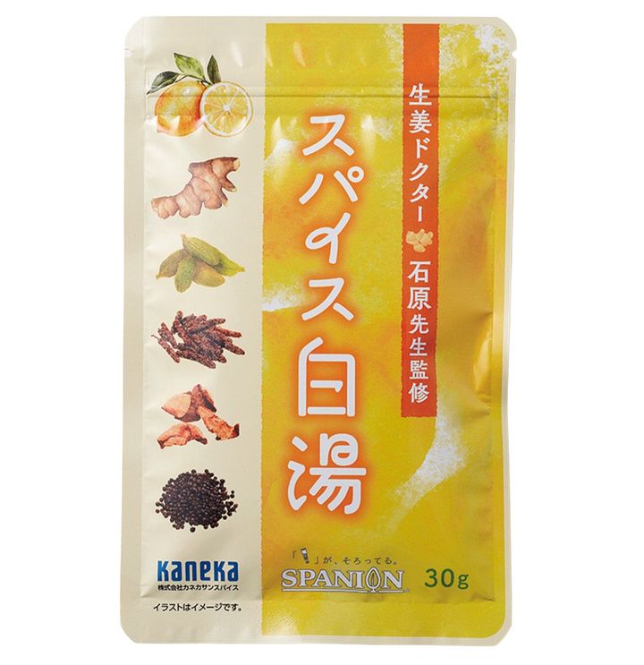5060℃の白湯200mLに小さじ1/4を入れて混ぜるだけ。生姜、カルダモン、ヒハツなど7種の原料配合。SPANIONスパイス白湯 30g ¥1,188(カネカサンスパイス)