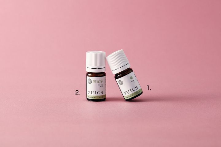 1.飛騨高山のヒノキの木を採用。さわやかでリフレッシュできる香り。yuica オリジナルエッセンシャルオイル ヒノキ(木部)5mL ¥1,870 2.リラックス効果や抗菌作用が期待される甘やかでフローラルな香り。yuica オリジナルエッセンシャルオイル クロモジ(枝葉部)5mL ¥10,120(共にyuica)
