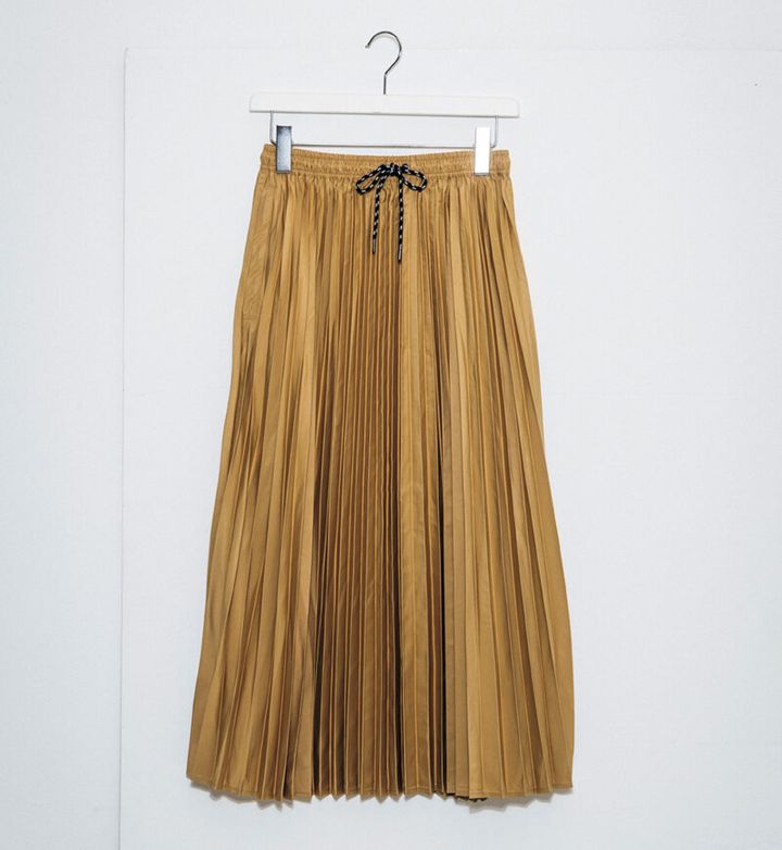 細プリーツの縦のラインと、適度なハリのある落ちる素材感で、やせ見え効果も。