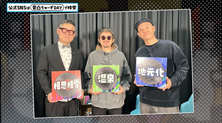 MC下埜正太がアーティストに「凸撃」訪問してインタビューする音楽トーク番組『音凸ちゅーずDAY』(ABCテレビ)。アーティストがレコードに書かれたトークテーマを「ちゅーず!」して、 下埜の音楽知識と話術を武器に、ちょっと攻めたトークを展開します。