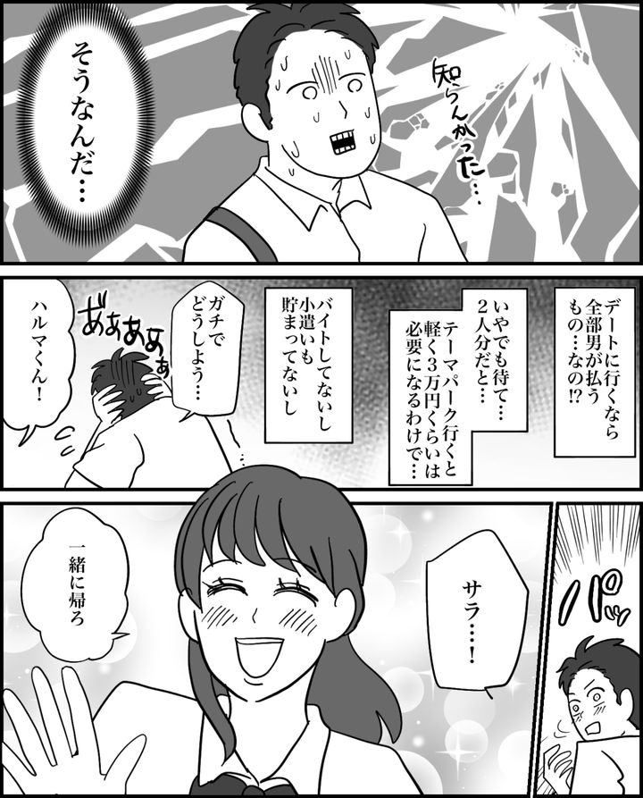サラは以前からテーマパークへ行きたいと言っていました。誕生日の記念デートをするならテーマパークしかありません。誘ってみると嬉しそうに賛成してくれたサラ。けれど俺は、女子たちの「デートは男が全部奢るべき」「お金がないなら誘うな」という会話を偶然耳にして焦っていました。だからつい「財布は持ってこなくていいよ」とカッコつけてしまったのです。