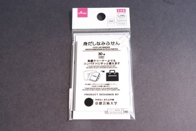 こちらの商品は衣類クリーナーで、よくある粘着クリーナーと同じ役割のアイテムです。粘着テープのふせんは30枚あり、普段使いに重宝します。
