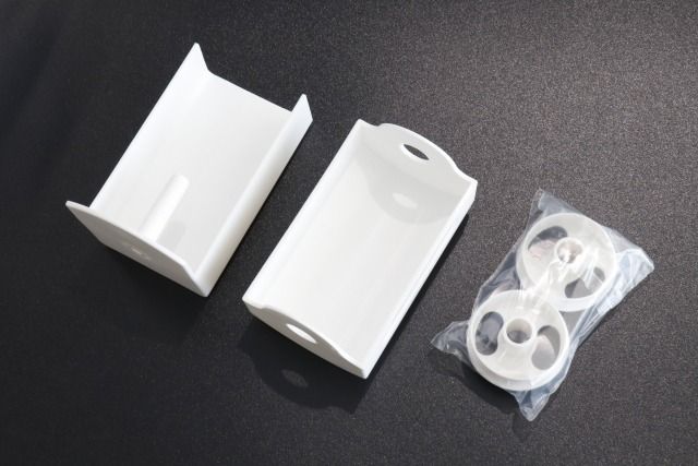 セット内容はストッパー付きの台、本体ケース、ホルダー2つ、粘着式のマグネット。粘着テープ自体は別売りなので別途用意しましょう。