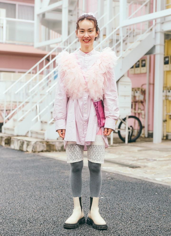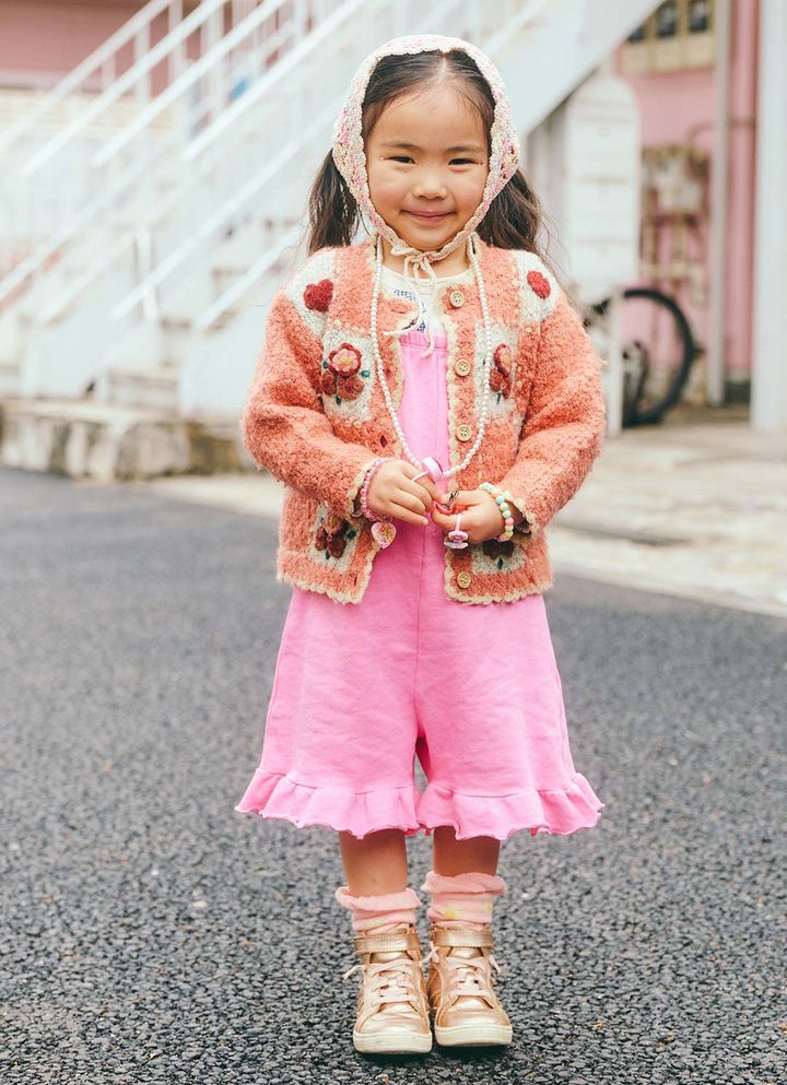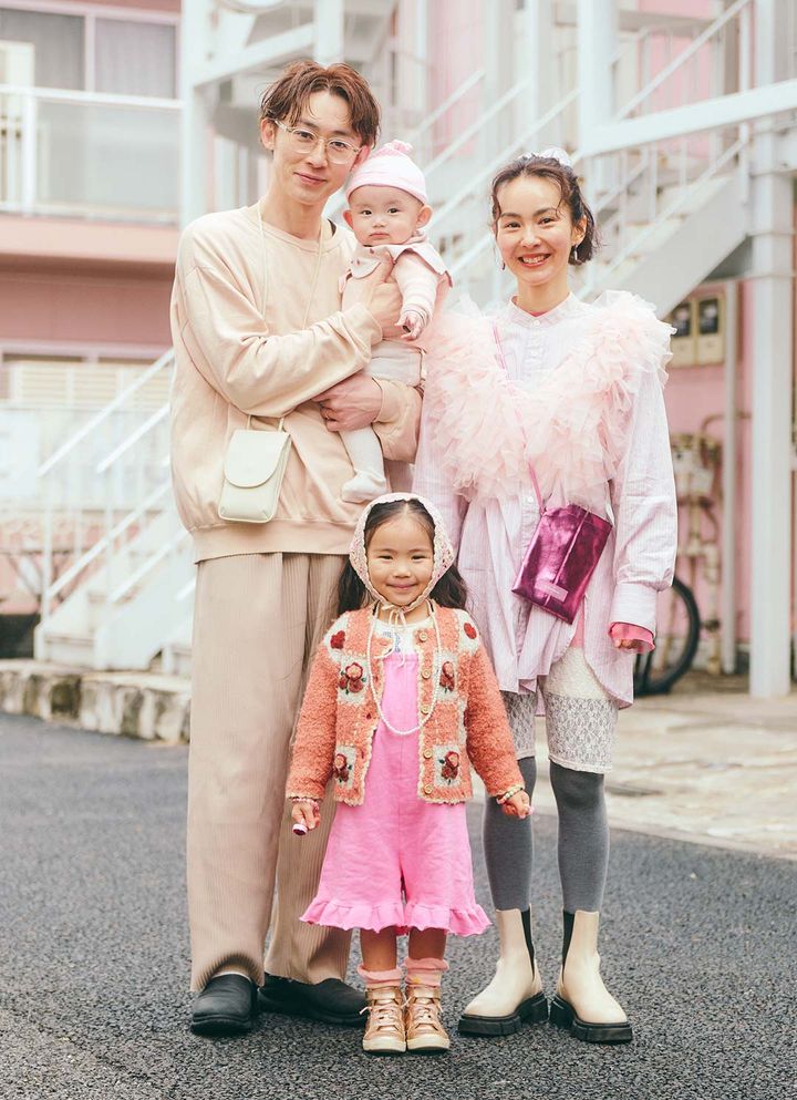 ペールピンクからヴィヴィッドピンクまで、家族全員でピンクのグラデーションを描いた春爛漫コーデ。チュールやメタリックなど素材でメリハリをつけて、立体感を出したのがワンカラーコーデのポイント。