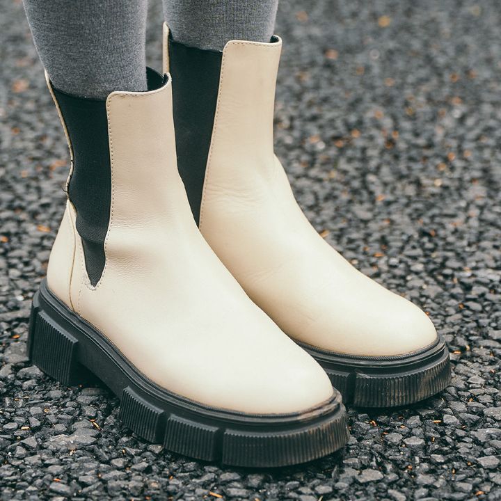 サイドゴアブーツは、厚底ソールで存在感たっぷり。甘めの装いにエッジを加えて、甘辛バランスを仕上げる頼もしい一足。