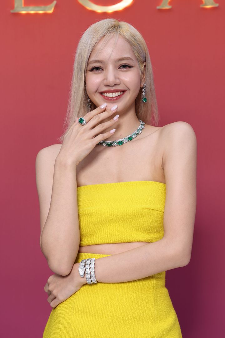 グローバルアンバサダーを務める「ブルガリ」のイベントにて。珍しく前髪をサイドに流し、ストラップレスドレスをまとったリサは、いつもより大人っぽい雰囲気。なめらかなデコルテに、豪華なジュエリーがよく映える。