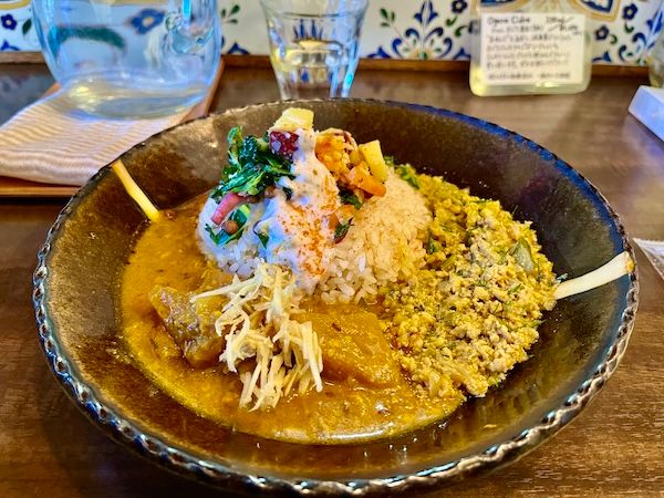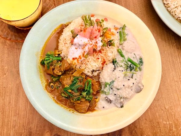 先日伺った時は、「旬野菜とナッツの白いカレー」と「アレッタとポークのカレー」の2種がけ(1,700円)を選びました(下の写真)。「発酵白菜とアサリのカレー」とも迷った末の2択。ちなみにアレッタはブロッコリーとケールを掛け合わせた野菜だそう。副菜のライタ(ゆかりとヨーグルト)など副菜を混ぜ込むとまた絶妙。